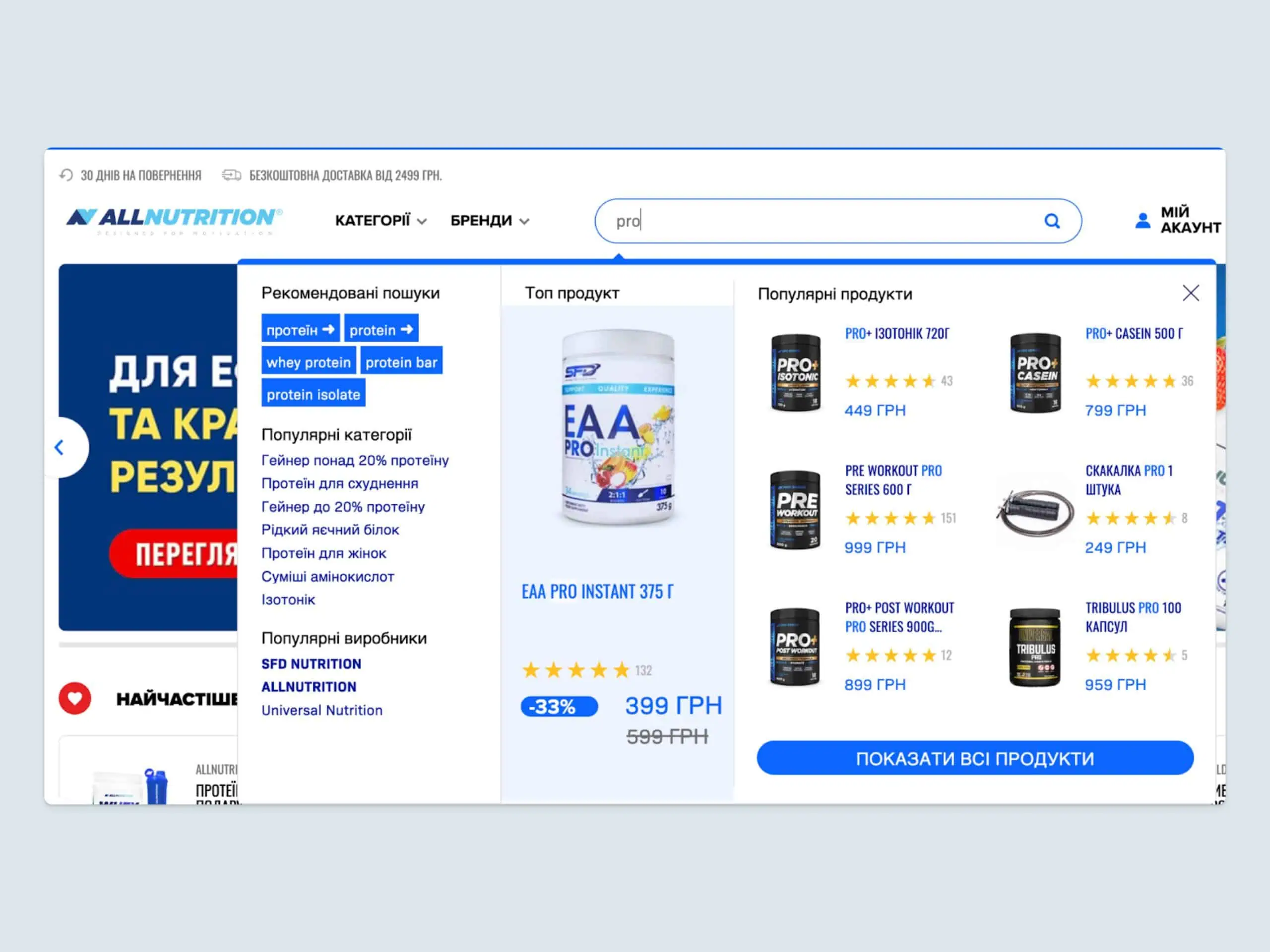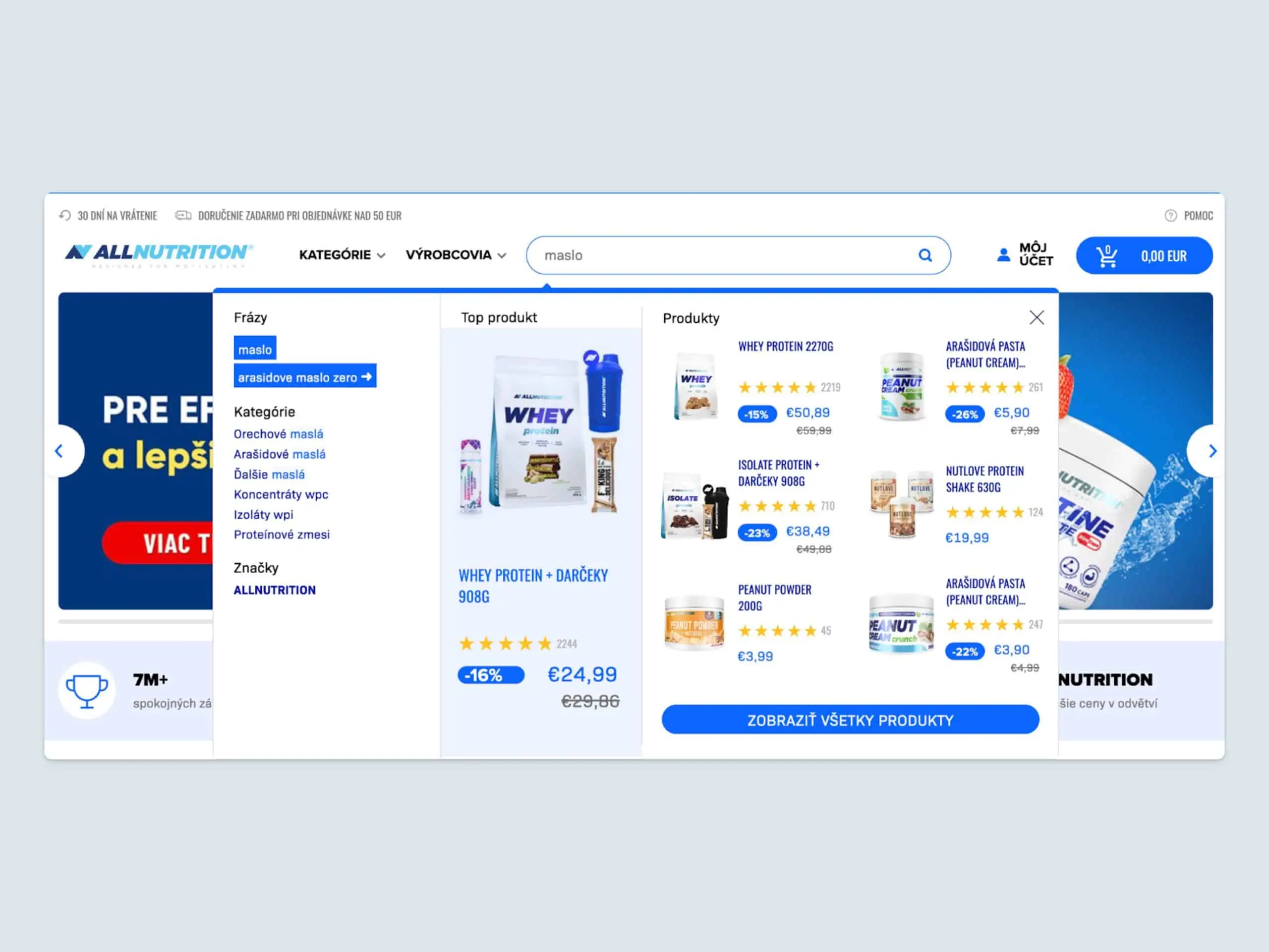 Beispielsweise werden Suchanfragen in Autocomplete bei hervorgehobenen Produkten blau markiert, sodass sie sofort ins Auge fallen. Das Team von Luigi’s Box unterstützte diese Anpassungen und stellte optimale Leistung und Nutzererlebnis sicher.